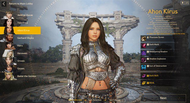 ในเกมนี้จะตัวละครทั้งหมด 9 ตัวละคร (ณ ปัจจุบัน) ซึ่งเป็นวีรชนตัวแทนจากอาชีพต่างๆ ในเกม Black Desert โดยทุกตัวละครนั้นจะมีสกิลให้เล่นทั้งหมด 4 สกิล และท่าโจมตีสองท่า รวมไปถึงท่าหลบอีกด้วย โดยหลักการของเกมนี้นั่นก็คือคนเล่นจะต้องไปตบตีกับมอนสเตอร์ก่อนเพื่อสะสม EXP เมื่อตัวละครเลเวลอัพ ก็จะสามารถเลือกอัพเกรดสกิลได้ แปลว่า ยิ่งฆ่ามอนสเตอร์หรือปะทะกับคนเล่นจริงๆ แล้ว เลเวลของเราก็จะเยอะและก็จะได้เปรียบมากขึ้น