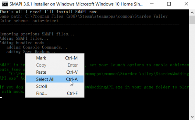 โดยแตกไฟล์ Zip ของ SMAPI แล้วรันไฟล์ install on Windows แล้วกดปุ่ม 1 เพื่อ Install SMAPI