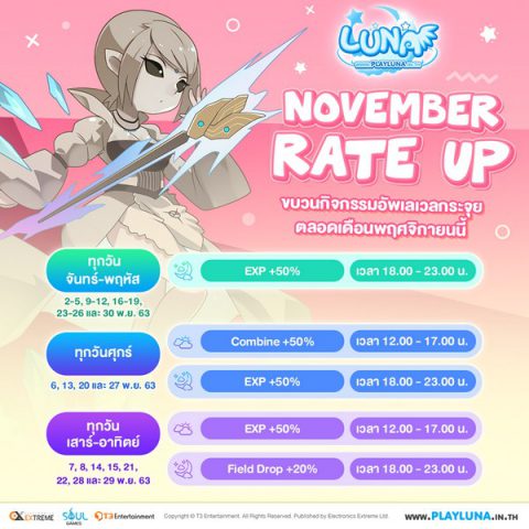 และขบวนกิจกรรมอัพเลเวลกระจุย กับ November Rate Up และ Daily Supply รับไอเทมฟรีทุกวัน เมื่อเข้าเล่นเกมช่วง 12.00 – 14.00 น. และรับเพิ่มอีกเมื่อเข้าเล่นเกมช่วง 18.00 – 21.00 น. ทุกวันจันทร์-ศุกร์ ตลอดเดือนพฤศจิกายนนี้ พร้อมกิจกรรม Holiday Supply รับไอเทมฟรีทุกวันหยุด