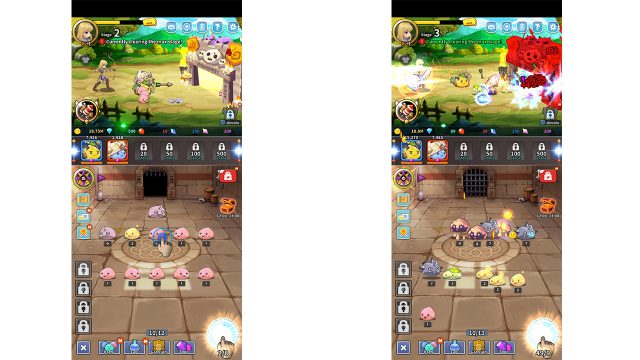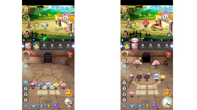 ด้านบนคือ IDLE ที่่เราจะได้เห็นตัวละครสู้วนไปวนมา หากสู้ไม่ไหวก็จะวนซํ้าๆ ในด่านเดิม ส่วนด้านล่างนั้นคือส่วนที่คนเล่นจะสามารถควบคุมตัวละครในการจับเอาปอร์ริ่งสีเดียวกัน ประเภทเดียวกันเอามาผสม และตัวที่เราผสมได้ก็จะถูกส่งขึ้นไปช่วยตัวละครหลัดสู้ในฉากด้านบนนั่นเอง