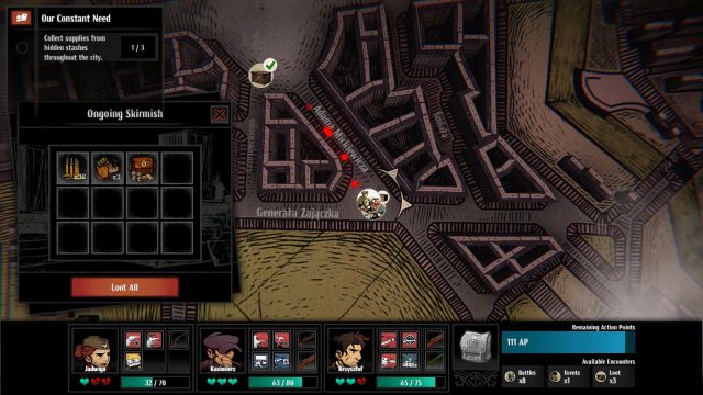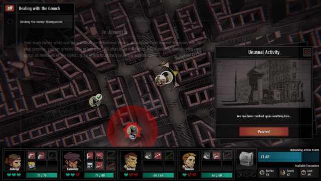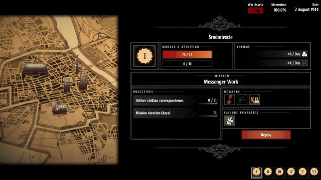 ตัวเกมเพลย์นั้นจะแตกต่างจาก Darkest Dungeon อยู่ตรงที่ว่า เมื่อเริ่มฉาก เราจะอยู่ในพื้นที่กรุงวอซอร์ ซึ่งจะต้องดำเนินตามภารกิจของด่านนั้นๆ เช่น กำจัดนาซี ช่วยผู้คน หรือไปหาแนวร่วมต่อต้านนาซี ซึ่งเราจะต้องเดินหาในแผนที่กว้างๆนั่นแหละ โชคดีที่ยังมีลูกศรนำทาง ในจุดที่เป็น Activity เช่น ศัตรู Event กล่องเก็บไอเทม ฯลฯ และบางทีเราอาจจะโดนทหารนาซีเห็นตัวและเข้าสู่ฉากต่อสู้ทันที หรือหากเป็นจุด Event จะสามารถเข้าไปช่วยเหลือได้ โดยเป็นตัวเลือกให้เลือก หากเลือกถูกจะได้รับค่าตอบแทนที่สมน้ำสมเนื้อ หากตอบผิดอาจจะสูญเสียสมาชิกไปเลย