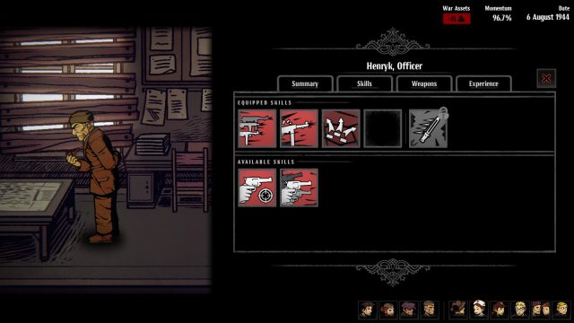 สำหรับตัวละครในเกมนี้ไม่สามารถใช้ทิ้งขว้างได้แบบ Darkest Dungeon เนื่องจากว่าตัวละครใหม่จะมากับ Event ประจำสัปาดห์เท่านั้น (มีบางสัปดาห์) แต่เราสามารถเกณฑ์เด็กใหม่มาเข้ากองทัพได้ แต่เด็กใหม่จะไม่สามารถเปลี่ยนอาวุธหรืออัพ Skill ได้ โดยการอัพ Skill ทำได้เฉพาะตัวละครหลักเท่านั้น ซึ่งจะเป็นการใช้แต้ม EXP อัพสกิลหรือค่า Status ที่ต้องการเพื่อเพิ่มความแข็งแกร่งได้ และยังต้องมาจัดสกิลของแต่ละตัวละครอีกที