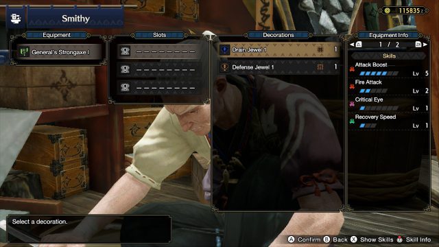 เราสามารถสร้างเพชรได้จากคำสั่ง Decorations ในร้านอาวุธ หลังขึ้น Hi-Rank โดยจะนำเพชรมาติดในอาวุธหรือเครื่องป้องกันเพื่อได้รับสกิลนั้นๆ ด้วยคำสั่ง Set Decorations ส่วนชนิดของเพชรสามารถเพิ่มได้เมื่อมี Rank มากขึ้น