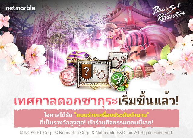 วันนี้ เน็ตมาร์เบิ้ลคอร์ปอเรชั่น ได้ประกาศถึงการอัปเดตครั้งใหม่ของเกมแอคชั่นฟอร์มยักษ์อย่างเกม Blade&Soul Revolution ที่นำเสนอศิลปะการต่อสู้แบบผสมผสานในรูปแบบเกมมือถือ MMORPG นำเสนอเรื่องราวการแก้แค้นสุดตื่นตาตื่นใจจากเกม PC Blade&Soul สู่เกมมือถือสุดฮิต ในการอัปเดตครั้งนี้ ผู้เล่นจะได้ตื่นตาตื่นใจและสนุกสนานไปกับการอัปเดต ‘เทศกาลดอกซากุระ’ ตั้งแต่ 13 เมษายน – 13 พฤษภาคม นี้ ยิ่งไปกว่านั้นในการอัปเดตครั้งนี้เน็ตมาร์เบิ้ลยังได้นำเสนอความสนุกรูปแบบใหม่อย่าง ‘ดันเจี้ยน 1 คน’ ให้ผู้เล่นสนุกสนานไปกับการใช้กลยุทธ์ต่างๆ พร้อมรับของรางวัลสุดพิเศษมากมาย