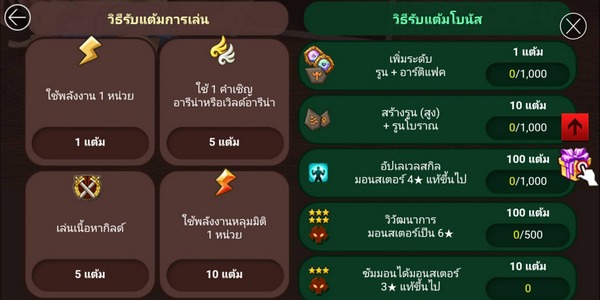 วิธีรับแต้มโบนัส - เพิ่มระดับรูน + อาร์ติแฟค – 1 แต้ม (รับได้มากสุด 1,000 แต้ม)