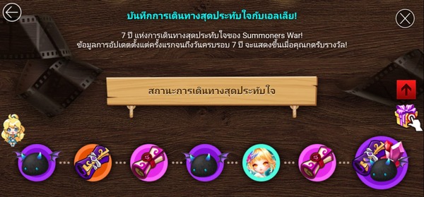 7 ปี แห่งการเดินทางสุดประทับใจของ Summoners War! ข้อมูลการอัปเดตตั้งแต่ครั้งแรกจนถึงวันครบรอบ 7 ปี จะแสดงขึ้นเมื่อคุณกดรับรางวัล! แค่สะสมการใช้พลังงานเรื่อยก็รับรางวัลตามเลเวลการเดินทางไปด้วยกันเลยค่ะ โดยรางวัลสุดพิเศษในกิจกรรมนี้คือ คัมภีร์ในตำนาน, คัมภีร์แสง & มืด, ชุดแปลงร่างราชินีแฟรี่สุดลิมิเต็ด ทุกคนต้องรักน้องฟรานและอยากได้ชุดใหม่น้องกันแน่นอนค่ะ และความดีงามของกิจกรรมนี้ ทุกๆเลเวลที่ปลดล็อคของรางวัลกิจกรรม ข้อมูลรำลึกวันวานตั้งแต่วันแรกที่เกมเปิดจะเผยออกมาทีละนิดละหน่อยให้ทุกคนได้คิดถึงกันค่า