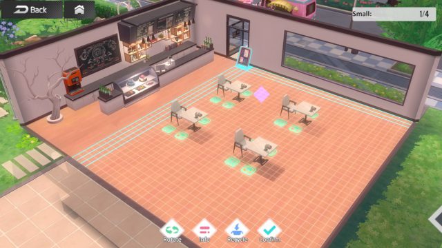 และอีกส่วนก็คือบริการร้านคาเฟ่ โดยคนเล่นจะสามารถปลดล็อคในการขายกาแฟและขนมต้อนรับลูกค้า และจะสามารถสะสมเงินเอาไปซื้อของตกแต่งร้านได้อีกด้วย (ตกแต่งวางตำแหน่งของได้ตามใจชอบ) ซึ่งเกมเป็นแบบ 3D หมุนฉากได้ตามใจชอบอีกต่างหาก