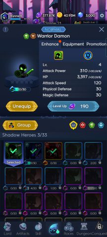 – Shadow : อัพเกรด LV ด้วย Soul Stones ที่ได้จากการกำจัดมอนสเตอร์เช่นกัน นอกจากนี้หากสะสมดวงวิญญาณมากพอจะสามารถเลื่อนขั้นตัวละครเพิ่มดาวได้