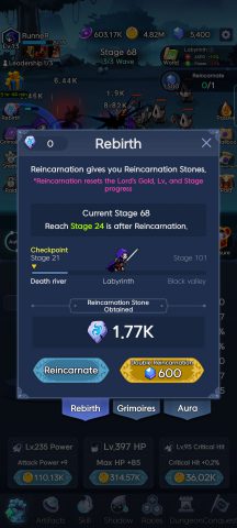 นอกจากนี้เรายังสามารถใช้คำสั่งเกิดใหม่ (Rebirth) เมื่อไม่สามารถผ่านด่านต่อไปได้อีกแล้วก็ไปเกิดใหม่ซะเลย แม้จะต้องอัพเกรดพลัง Lord ใหม่ (แต่ไม่ต้องอัพ Shadow ใหม่) แต่จะได้รับหินมาอัพเกรด Grimoire เพิ่มความแข็งแกร่งให้ Lord มากยิ่งขึ้น ยิ่งเกิดใหม่ยิ่งแข็งแกร่ง