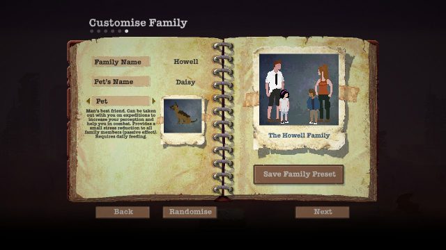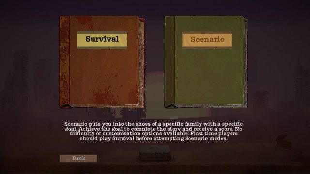 ตัวเกมจะมี 2 โหมดให้เล่น Survival และ Scenario ซึ่ง Survival เป็นการเอาชีวิตรอดเรื่อยๆ โดยให้สร้าง 1 ครอบครัว ผู้ใหญ่ 2 คน และ เด็ก 2 คน ส่วน Scenario เป็นการเล่นเนื้อเรื่องของครอบครัวนึงเมื่อผ่านจะได้เล่นครอบครัวต่อไป