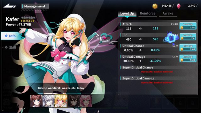 ในส่วนอีก 4 ตัวละครนั้นจะมีสกิลเป็นของตัวเองและคนเล่นจะสามารถกดอัพเกรดได้ หลักการเดียวกันกับเกม IDLE ปกติที่จะใช้ทรัพยากรเฉพาะส่วนนั้นๆ ในการอัพเกรดและฟาร์มได้จากในเกม ยิ่งปลดล็อคเยอะก็จะสามารถทำให้ตัวละครเก่งยิ่งขึ้น