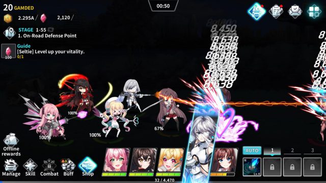 ตอนที่ตัวละครวิ่งสู้ในเกมนั้นจะสู้แบบอัตโนมัติ ส่วนสกิลคนเล่นเลือกได้ว่าจะให้สู้ออโต้หรือจะกดเอง กรณีที่มีตัวละครตายก็จะฟื้นมาได้หากชนะบอสในชั้นนั้นๆ แล้ว แต่หากแพ้ก็จะย้อนกลับไปเล่นชั้นก่อนหน้านี้่ โดยเกมจะสู้กับบอสให้เองอัตโนมัติ
