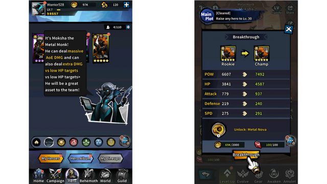 อีกระบบเด่นหนึ่งก็คือ เบเฮมุช ที่จะเป็นการปลดผลึก เบเฮมุช ที่ถูกพวกตัวร้ายผนึกเอาไว้มาเป็นพวกเรา และก็จะเป็นสกิลท่าไม้ตายพิเศษแยกจากตัวละครในเกม เป็นอะไรที่เราไม่เคยเห็นมาก่อนในเกม IDLE เหมือนมีตัวละครลับมาช่วย แต่ก็คือจะใช้งานแบบออโต้ โดยที่เราไม่ต้องไปกดยุ่งอะไรด้วย