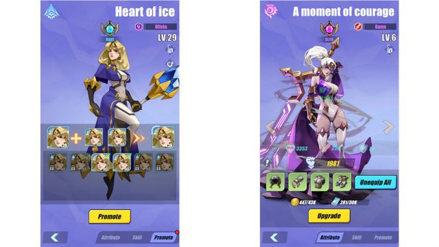 อีกจุดหนึ่งที่น่าสนใจสำหรับเกมนี้คือการอัพเกรด การใส่อุปกรณ์ หรือโหมดแนวสะสมที่จะได้รับของรางวัลหากสะสมตัวละครไปได้เรื่อยๆ นั้นทุกอย่างทำได้ในปุ่มเดียว ไม่ต้องไปนั่งจิ้มทีละตัวๆ ให้เสียเวลา เกมจึงเข้าถึงได้ง่ายและไม่เสียเวลาไปกับตัวเกมมากนัก
