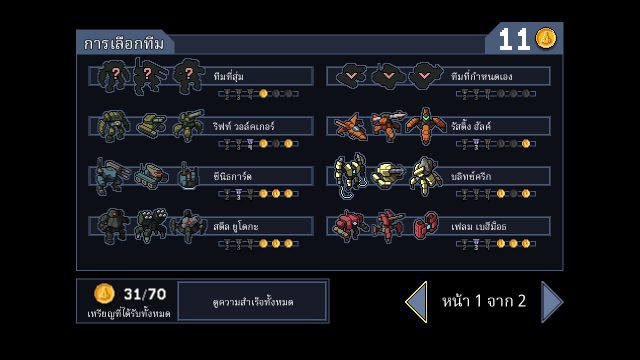 เราจะเลือกทีมของหุ่นยนต์ก่อน โดยเริ่มต้นจะใช้ทีมทั่วไป แต่หากเล่นจนได้เหรียญนำมาปลดล็อคทีมอื่นๆต่อๆได้ ส่วนนักท่องกาลเวลาคือ นักบิน ระดับพิเศษซึ่งจะมีความสามารถพิเศษ 3 อย่าง (นักบินทั่วไปมี 2 อย่างเมื่อ LV เต็ม) ซึ่งหากเราเล่นจนเกมโอเวอร์สามารถเลือกนักบินคนหนึ่งมาเล่นต่อได้ (จะได้ไม่ต้องเก็บ LV ใหม่) ทีมทั้งหมดมี 14 ทีม สามารถเลือกทีมเอง เลือกแบบสุ่ม หรือหุ่นแต่ละทีมมาสร้างทีมที่ชอบได้