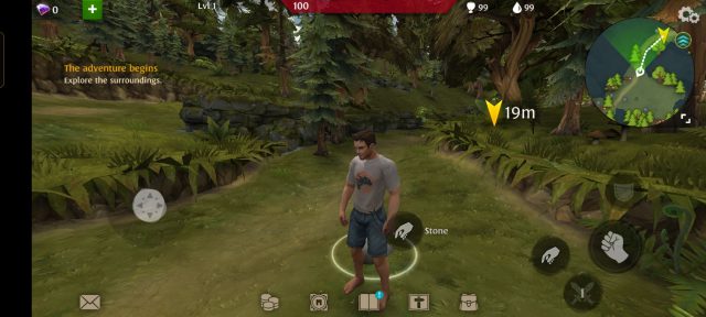เริ่มแรกเรามาแบบตัวเปล่าๆเลย แต่สามารถเก็บไอเทมข้างทางพวก ท่อนไม้ ก้อนหิน มาทำเป็นขวานหินได้ ซึ่งขวานหินสามารถนำมาตัดต้นไม้หรือเป็นอาวุธได้ด้วย โดยแผนที่มุมบนขวามีรูปไอเทมที่สามารถเก็บได้แสดงเอาไว้