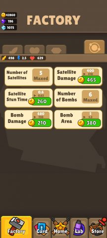 การอัพเกรดจะแบ่งออกเป็น 4 แถบคร่าวๆ ซึ่งสามารถใช้เงินปลดล็อคความสามารถใหม่ๆเพิ่มขึ้นได้เล่น ยิงกระจาย ยิงเบิ้ล ปลดล็อคดาวเทียม เกราะ ฯลฯ