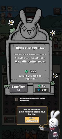 เมื่อการเล่นรู้สึกว่ายากขึ้น มอนสเตอร์โหดจนไม่สามารถผ่านไปได้ พ่ายแพ้ให้กับมอนสเตอร์ จะสามารถเกิดใหม่ [Rebirth] ได้ โดยจะเริ่มเล่นที่ด่าน 1 ใหม่หมดเลย การอัพเกรดด้วย Gold จะถูกลบล้าง แต่การอัพเกรดตัวละครจะยังคงอยู่ และยังได้ Gem และ หัวใจสีเขียว ตามจำนวนด่านที่สามารถผ่านได้มาอัพเกรดต่อ ในการเกิดใหม่ครั้งนี้เราจะเก่งขึ้นกว่าเดิม!!