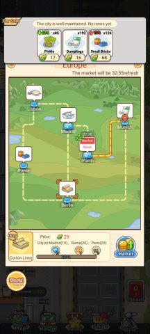 นอกจากนี้ หากกดกดปุ่ม World เพื่อดูเส้นทาง ซึ่งจะแสดงรายละเอียดว่า แต่ละเมืองต้องการสินค้าอะไร จากนั้นไปกดดูเส้นทางที่เราไปว่าต้องการสินค้าอะไร สามารถซื้อสินค้าจาก Market เพื่อไปเทรดในเมืองที่เราจะไปขายทำกำไรได้ด้วย (ใช้โบกี้บรรทุกของ หรือ โบกี้บรรทุกแร่ แล้วแต่รายการ) แต่อย่าลืมว่าขบวนของเราขนของได้จำกัด อย่าลืมจัดสรรแต่ละโบกี้ให้ดีแล้วทำกำไรให้ได้มากที่สุด
