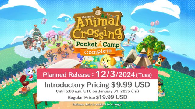 สำหรับ Animal Crossing: Pocket Camp Complete ถือเป็นเวอร์ชันเต็มของ Animal Crossing: Pocket Camp ที่อัดแน่นไปด้วย ไอเทม และ กิจกรรมต่างๆ จากการเปิดตัว ตลอดระยะเวลา 7 ปี ของเกมส์นี้ โดยจะยังคง การเล่นในรูปแบบเดิม แต่เปลี่ยนเป็นเวอร์ชัน Paid App หรือ แบบขายขาด โดยจะไม่มีส่วนของระบบ In-App Purchase การซื้อภายในแอพ อีกต่อไป นอกจากนั้นยังสามารถโอนย้ายข้อมูลส่วนหนึ่งจาก Animal Crossing: Pocket Camp มาเล่นกันต่อได้ด้วย สามารถย้ายได้จนถึง 2 มิถุนายน 2568 โดยเวอร์ชันใหม่นี้จะ ขายในราคา 9.99 เหรียญฯ ไปจน ถึง 31 มกราคม 2568 หลังจากนั้นจะ ปรับราคาไปเป็น 19.99 เหรียญฯ ใครเป็นแฟนซีรีย์นี้อยู่แล้ว ไม่ต้องรอช้าไปจัดกันตั้งแต่วันแรกที่เกมส์จะ เปิดวางจำหน่าย 3 ธันวาคม 2567 กันได้เลย