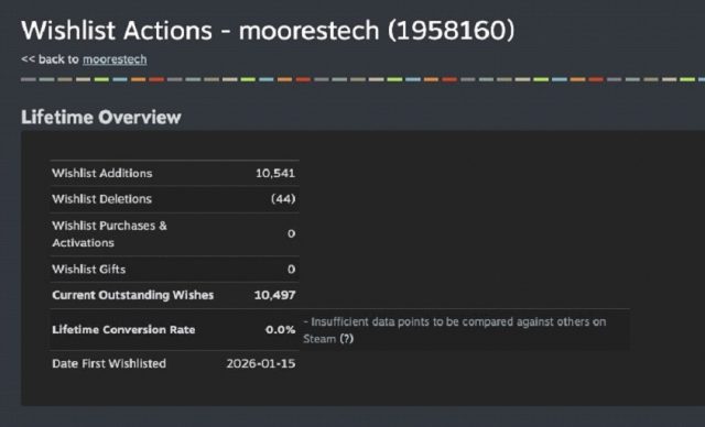 ผู้พัฒนาเกมอินดี้ “sakastudio” มีความยินดีที่จะประกาศว่า เกมจำลองโรงงานอัตโนมัติ ที่ขับเคลื่อนด้วย เฟือง ผสมผสานกับ RPG สไตล์อนิเมะ “moorestech” ซึ่งประกาศเมื่อวันที่ 15 มกราคม 2026 เวลา 10:00 น. JST มียอด wishlist เกิน 10,000 รายการ ภายในเวลา เพียง 23 ชั่วโมง หลังจากการเปิดตัวบนหน้า Steam store