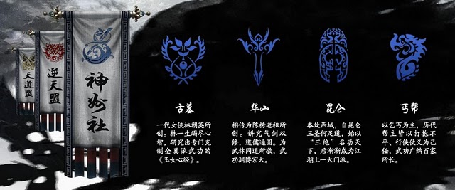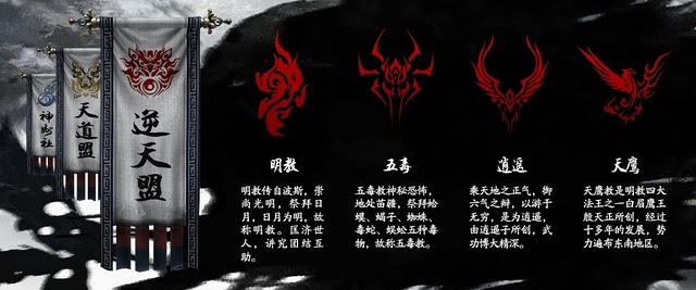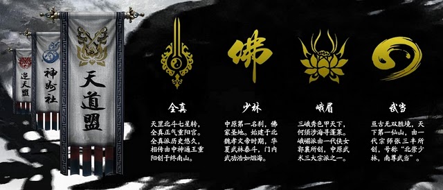 ใน Heaven Sword and Dragon Saber Online จะมีฝ่ายทั้งหมดสามฝ่าย คือ ฝ่ายธรรมะ ฝ่ายอธรรม และ ฝ่ายยุทธภพ แต่ละฝ่ายจะแยกเป็นอีก 4 สำนัก รวมแล้วก็จะมี 12 สำนักให้เราได้เลือกเล่น วันนี้เรามี วีดีโอเปิดตัวเกมส์นี้ตัวแรก และ สัญลักษณ์ ประจำสำนักต่างๆ และภาพตัวอย่างเล็กๆน้อยมาให้ชมกันก่อน