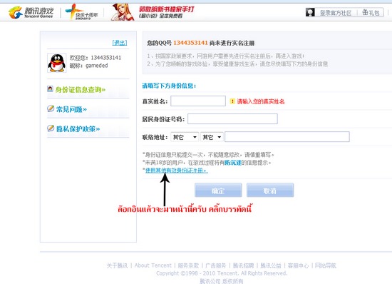 เมื่อกรอกรายละเอียดเสร็จ รอ Email จาก QQ ครับ เมลล์ที่จะใช้สมัครผมไม่แนะนำ Hotmail นะครับผมลองหลายรอบเมลล์ไม่เข้าเลยครับ ในเมลล์จะมีลิงค์ยืนยันให้เรากด เราก็กดยืนยันกันไป เป็นลิงค์ยาวๆ ประมาณ 2 บรรทัดนะครับ ตอนกดยืนยันเสร็จใต้ Email ของเราจะมีเลขประมาณ 10 ตัวให้เราจดเก็บไว้ด้วยนะครับ เพราะต้องใช้ ID ตอนเข้าเล่นครับ