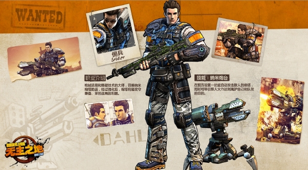 Borderlands Online มีตัวละคร 4 อาชีพให้เลือกเล่น ได้แก่ Soldier, Hunter, Siren และ Berserker และมีสกิลความสามารถที่แตกต่างกัน