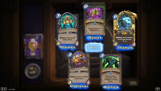 แพทนี้จะเป็นสายโทเทมโหดขึ้น ไม่ว่าจะเป็น Draenei Totemcarver : หากมี Totem อยู่บนสนาม +1/1 อย่างละ 1 ตัว ,Thunder Bluff Valiant : เมื่อใช้ Hero Power +2 Attack ให้ Totem เราทั้งสนาม และตัวรีเจ้นที่โหดที่สุด The Mistcaller : เมื่อตาย ไมเนี่ยมทั้งหมด ทั้งบนมือและในกอง +1/1 และยังมีการ์ดล้างสนามใหญ่ที่ใช้มานาเพียงนิดเดียว Elemental Destruction : โจมตีไมเนี่ยนทั้งหมด 4-5 damage และมานาผู้ใช้ติดล็อค