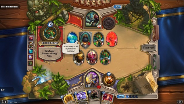 สำหรับเจ้าแห่งนากาตัวนี้ ตอนแรกจะอัญเชิญ นากาที่พลัง 1-1 และเทรินต่อไปจะอัญเชิญนากาที่มีพลัง 2-1 และ 3-1 ต่อไปเรื่อยๆถ้าเราไม่ทำลายหม้อต้ม Cauldron เสียก่อน ซึ่งหากเราทำลายหม้อต้มได้สำเร็จ ก็จะได้ Sir Finley Mrrgglton มาเป็นพวกซึ่งทำให้เราเปลี่ยนเลือกเปลี่ยน Hero Power และหยุดการอัญเชิญ Hungry Naga ของฝั่งนู้นได้ โดย Hero Power ของบอสจะกลายเป็น เพิ่มพลังโจมตี 2 ในเทรินนี้ เราแค่หาตัว Taunt หนาๆคอยกันไว้ก็สิ้นเรื่อง