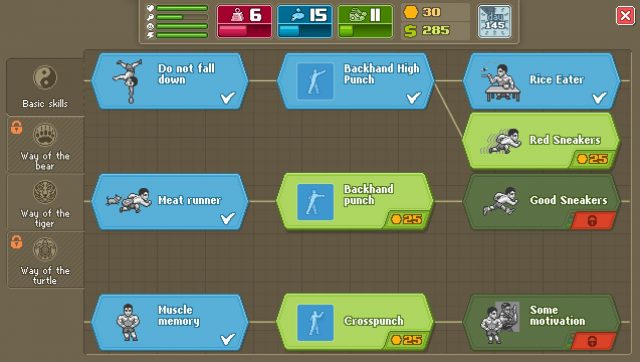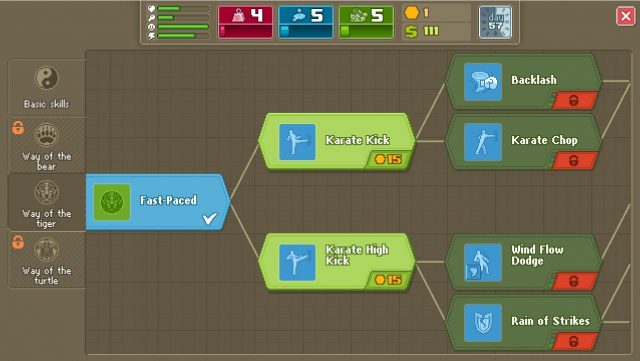 จุดเด่นเกมนี้คงหนีไม่พ้นการจัดสกิล และการอัพสกิล โดยสกิลจะแบ่งออกเป็น เบสิค และสกิลขั้นสูง ที่มีทั้งสกิลท่าหมี ท่าเสือ และท่าเต่า ซึ่งจะแตกต่างกันไปตาม Stat ที่เราเทรนนิ่ง