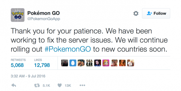 จากทวีตดังกล่าว สรุปได้ว่าทางทีมงานกำลังเร่งแก้ไขปัญหาและเตรียม server ให้พร้อมที่จะรองรับผู้เล่นทุกคนให้เล่นได้อย่างไม่ติดขัด และจะดำเนินการปล่อยเกม Pokemon GO ขึ้นสู่ Store ในประเทศอื่นๆต่อไป