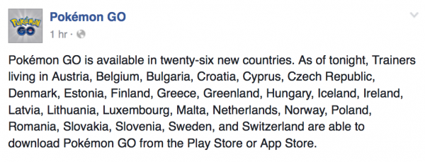 เมื่อ 1 ชั่วโมงที่แล้ว มีประกาศออกมาจาก official Twitter และ Facebook ของเกม Pokemon GO เกี่ยวกับการเปิดตัวเกมขึ้นสู่ store ประเทศอื่นๆเพิ่มเติมภายในคืนนี้ (ตามเวลาบ้านเค้า)