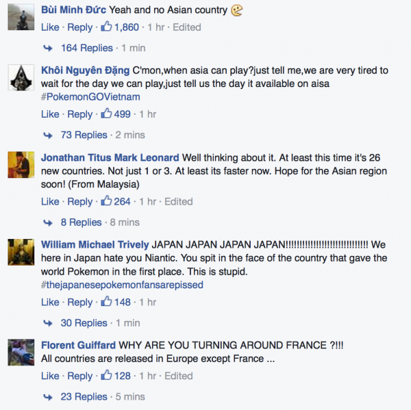 ซึ่งรายชื่อในลิสต์ด้านบนนั้นล้วนเป็นประเทศในแถบยุโรปและยังไม่มีประเทศในเอเชียแต่อย่างใด โดยในโพสต์ประกาศดังกล่าวก็มีชาวเอเชียเข้าไปสอบถามทำนองเดียวกันว่า เมื่อไหร่จะได้เล่น? บ้างก็บอกว่า ไหนล่ะญี่ปุ่น? นี่มันหยามประเทศชาติกำเนิดของโปเกมอนชัดๆ