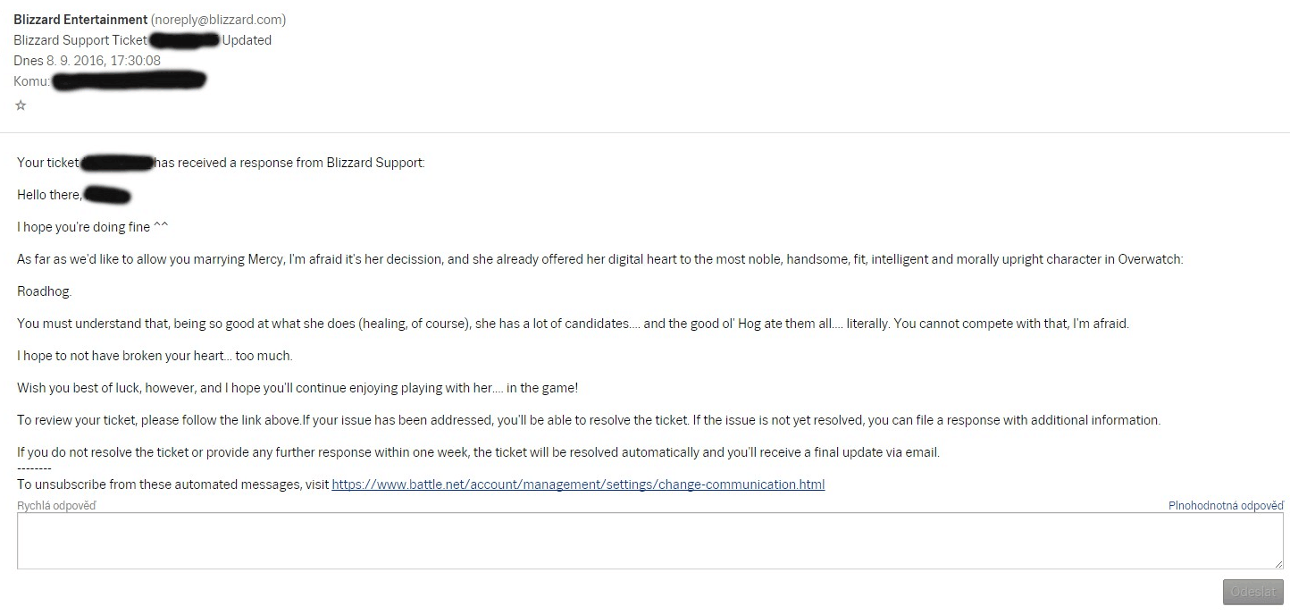 เพียงไม่นานก็มีการตอบกลับมาจากทีมงาน Customer Service ของ Overwatch แต่คำตอบที่ได้นั้นช่างทำร้ายจิตใจแฟนคลับของสาว Mercy เสียเหลือเกิน