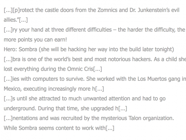 …Sombra เป็นหนึ่งใน Hacker ที่ยอดเยี่ยมที่สุด เธอเคยสูญเสียทุกอย่างในวัยเด็ก ในตอนที่ Omnic Cris[…] เธอทำงานให้กับกลุ่ม Los Muertos ในเม็กซิโก ด้วยการเพิ่มจำนวน[…] วันหนึ่งเธอรู้สึกว่าถูกสนใจมากเกินไปทำให้ต้องหลบลงไปใต้ดิน และใช้เวลานั้นอัพเกรด[…] […]ได้ถูกรับเข้าองค์กร Talon organization ในขณะที่ Sonbra ดูเหมือนจะทำงานให้กับ […]…
