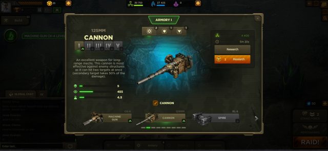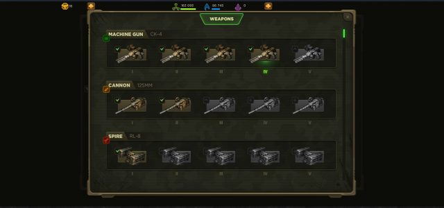 Weapon : สามารถติดอาวุธได้ 2 ชนิด ซึ่งอาวุธจะหาได้จากการวิจัย Armory ซึ่งจะมีอาวุธทั้งหมด 9 ชนิด อาทิเช่น Machine Gun ,Cannon ,Spire ,Fury ฯลฯ ซึ่งแต่ละชนิดจะมี 5 LV (ตามการวิจัย)