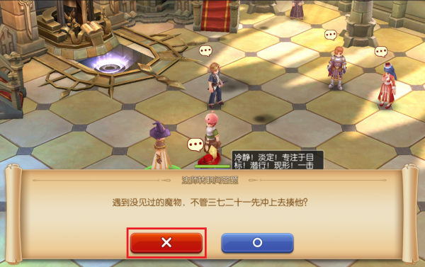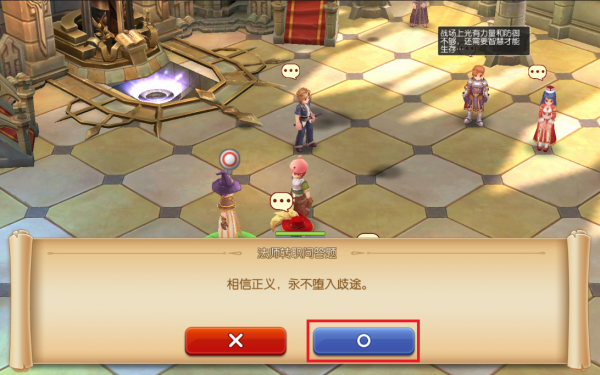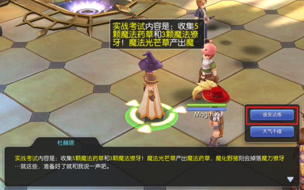 ขั้นตอนแรก เข้าไปเลือกคุยกับ NPC ของ Mage เพื่อรับเควส (ดูตำแหน่ง NPC ตามภาพด้านบน) จากนั้นกดรับเควสที่ปุ่มสีน้ำเงิน (กรอบสีแดง ตามภาพด้านล่าง)