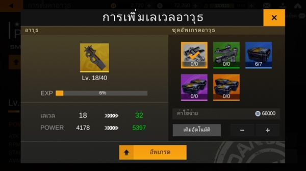 อาวุธก็เป็นอีกปัจจัยสำคัญ เพราะด่านหลังๆ ศัตรูจะถึกขึ้น ปืนต้องแรงพอที่จะสามารถล้มพวกนี้ให้ได้ไวที่สุด โดยการอัพเกรดอาวุธนั้นจะต้องไปเก็บชุดอัพเกรดอาวุธ โดยปกติจะได้จากบางด่าน (ดูตรงของรางวัล) เกรดอาวุธยิ่งดี จะทำให้อัพเกรดปืนได้ไว ส่วนการอัพเกรดปืนนั้นก็ทำได้โดยการหาชิ้นส่วนปืนนั้นๆ มาสะสมเหมือนกับหา DNA ของตัวละครตามด่านต่างๆ วิธีการที่จะได้อัพเกรดไวที่สุดคือซื้อแพ็คเกจ แต่เอาตรงๆ ราคาไม่ถูก แนะนำให้จ้องรอแบนเนอร์ราคา $0.99 (ประมาณ 33 บาท) หรือแพ็คที่ขายโดยใช้ทองในเกม 500จะดีกว่า เพราะจะได้ชิ้นส่วนอัพเกรดมากพอที่จะทำให้ปืนมีความโหดกว่าปกติ และถูกกว่าซื้อปกติด้วย