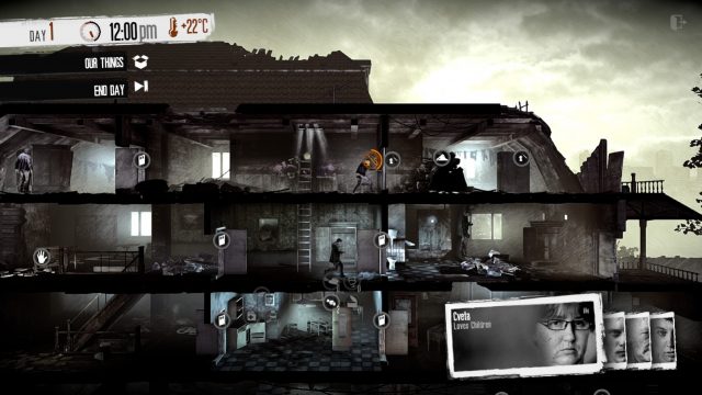 This War of Mine เป็นเกมแนว Survivor ที่ยอดเยี่ยมที่สุดเกมนึงของ ผู้เขียนที่ภูมิใจเสนอมาก โดยส่วนใหญ่เกมแนวๆสงคราม เราจะรับบทเป็นผู้พิชิตสามารถสร้างกองทัพไปบุกขยี้เมืองศัตรู หรือตะลุยแดนมอนสเตอร์ หรือแม้กระทั่งเอาตัวรอดจากซอมบี้ แต่ไม่ใช่สำหรับ This War of Mine ซึ่งเน้นการเล่าเรื่องสะท้อนความเป็นจริงของโลกในช่วงสงคราม ผ่านความคิดของตัวละครแต่ละตัว ศัตรูคือความหิวโหย และเหล่าผู้ที่ดิ้นรอดเอาตัวรอดเหมือนๆกัน โดยตัวเกมนั้นทำได้ออกมาอย่างเรียบง่าย แต่ได้อารมณ์และการตัดสินใจที่ดีมาก อีกทั้งยังออกแบบตัวละครแต่ละตัวให้มีสกิลในการเอาตัวรอดแตกต่างกันมาอยู่ร่วมกันในบ้านหลังหนึ่ง พวกเขาจะมีชีวิตรอดจนจบช่วงสงครามหรือไม่ ขึ้นอยู่กับการตัดสินใจของคุณ!