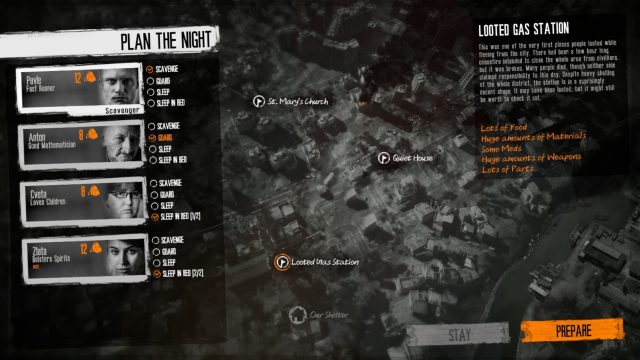 ช่วงกลางคืน : เลือกสถานที่ ออกค้นหา อาหาร-ยา หรือวัตถุดิบ ,พักผ่อน ,เฝ้ายาม