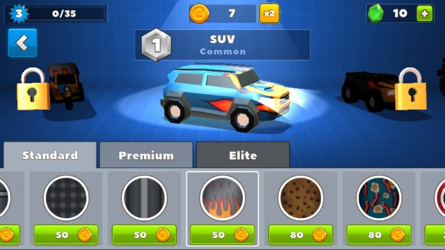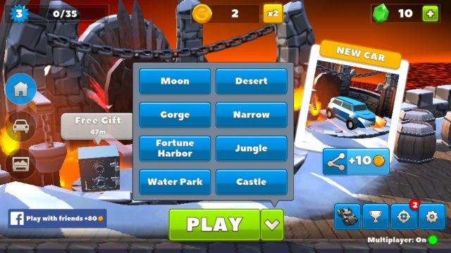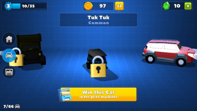 นอกจากนี้ ยังสามารถเปลี่ยนรถ ได้ที่เมนู Cars (ที่เป็นรูปรถ) ด้านซ้าย โดยมีรถให้เลือกถึง 66 คัน ซึ่งต้องหาเงินมาสุ่มใน Machine เท่านั้น (อ้อ ในเกมนี้มีรถตุ๊กๆของไทยด้วยนะเอ้อ แต่ต้องสุ่มใน Machine) สำหรับการหาเงินให้ได้มากๆ ทำได้โดยการเก็บมงกุฎให้มากที่สุด หรือทำเควสประจำวัน วันละ 3 เควส แล้วนำมาสุ่มรถใหม่ได้ หรือปรับแต่งสีหรือลายรถได้อีกด้วย