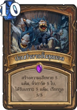 การ์ดระดับตำนานที่นิยมที่สุดในแพท KFT สามาถใส่ได้ทุก Deck ที่เป็น Control หรือใส่ใน Midrange ด้วยพลังที่คุ้มค่าร่าย 8/8 พร้อมยั่วยุ แถมจบเทิร์นยังได้การ์ด Death Knight แบบสุ่ม 1 ใบ (ทั้งหมด 8 แบบ) ซึ่งได้ใบไหนก็คุ้มแหละ ดังนั้นจึงเหมาะกับการคราฟมากสุด เพราะใช้ได้ทุกคลาสและแทบทุก Deck นึกอะไรไม่ออกโยนลิชคิงลงไปได้