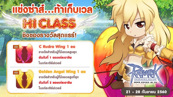 ท้าดวลแข่งเก็บเวลสุดมันส์ ต้อนรับอาชีพใหม่ Hi-Class ชิงรางวัลไอเทมแรร์ ปีกนางฟ้าสีแดง C Rudra wing และ ปีกนางฟ้าสีทอง Golden Angel Wing ตั้งแต่วันนี้ – 28 ก.ย. 60