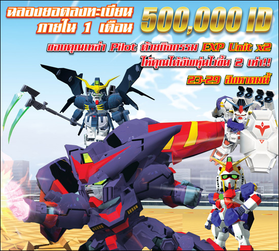 SDGO ร่วมฉลองตอบรับกระแสแรงไม่หยุด กับยอดลงทะเบียนเล่นเกมส์ทะลุ 500,000 ID อย่างรวดเร็วในเวลาเดือนเดียวเท่านั้น ด้วยการจัดค่า Unit EXP x2 ให้แบบเต็มพิกัด ทั้งใน Mission Mode และ VS Mode ตลอด 24 ชั่วโมง เป็นเวลานาน 1 สัปดาห์เลยทีเดียว งานนี้จะ Mix Plan หรืออัพหุ่นตัวไหนก็สะสมเลเวลได้ครบสูตรอย่างไวแน่นอน