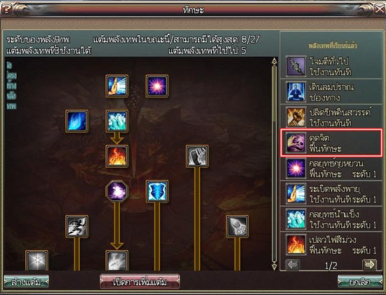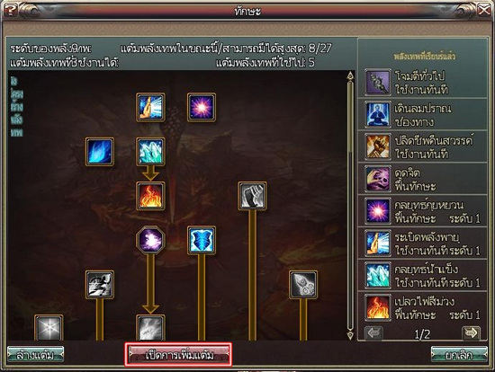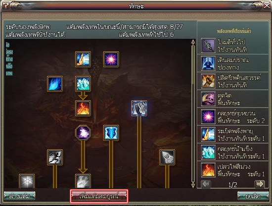 1.2 หากต้องการอัพสกิลสามารถกดปุ่ม N เปิดหน้าต่าง “ทักษะ” จากนั้นกดไอคอล “เปิดการเพิ่มแต้ม” ตัวเกมส์ออนไลน์จะแสดงให้เห็นทันทีว่าขณะนี้ตัวละครของเพื่อนๆ สามารถอัพสกิลไหนได้บ้าง ใช้เม้าท์ซ้ายคลิกไอคอลสกิลที่ต้องการอัพ จากนั้น กดไอคอล “เพิ่มแต้มสมบูรณ์”