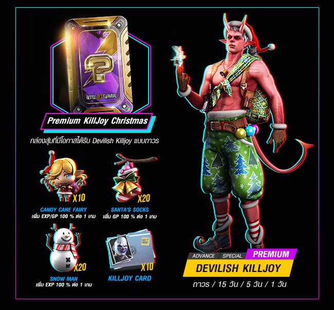 และอีกหนึ่งอย่างที่เข้าใน Carnival Store คือ กาชาชุดนั่นเอง เป็นอย่างอื่นไปไม่ได้อย่างแน่นอน ซึ่งชุดในการอัพเดทครั้งนี้ เป็นการต้อนรับเทศกาลคริสต์มาสได้อย่างดีเลยทีเดียว ที่จะมี Killjoy, Natasha และ The Lady ที่มีชุดใหม่เข้ามาให้เพื่อนๆ ได้สุ่มกันและชุดภายในเกมนี้จะเพิ่มความสามารถให้กับตัวเองนั้นๆ อีกด้วยนะ ไม่ใช่แค่ใส่สวยๆ ธรรมดา