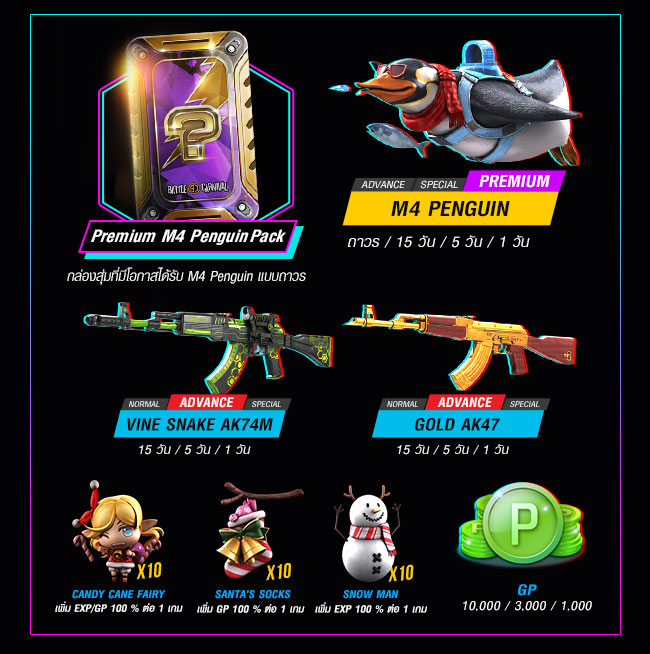อันนี้แค่ Shop ธรรมดายังมี Shop ใน Carnival Store อีกด้วยหรือเรียกง่ายๆ ว่าเปิดกาชานั้นแหละ โดยมีการอัพเดท ปืนใหม่ในตู้กาชาแล้วด้วย โดยมี 2 ปืนด้วยกันมาให้ผู้เล่นสามารถเลือกเปิด เพื่อวััดดวงกันไปเลยว่าจะได้อะไรเด็ดๆ มั้ย โดย highlight ของการอัพเดทครั้งนี้อยู่ที่ ปืนเพนกวิน !! อ่านไม่ผิดอย่างแน่นอน ปืินเพนกวินนี้แหละที่ทำออกได้น่ารักแบบกวนๆ ได้พอสมควร โดยเป็นประเภทปืน M4 Penguin ที่เวลาเติมกระสุนจะเป็นการโยนปลาให้เพนกวินกินแทนการใส่แม็คกระสุน ซึ่งภายใน Pack ก็จะมีของรางวัลอื่นๆ อีกมาก