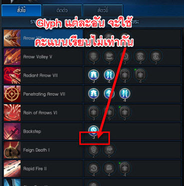 วิธีการอัพ Glyph ก็ไม่ยาก ผู้เล่นสามารถดูได้หน้าสกิล (ปุ่ม K) ว่ามีอะไรให้อัพบ้าง ซึ่งหากสังเกตุจะพบใต้วงกลม Glyph แต่ละอัน จะมีตัวเลขติดอยู่ นั่นก็คือ ค่าคะแนนที่ใช้ในการเรียน Glyph บางอันใช้ 3 คะแนน บางออฟชั่นก็ต้องการ 4-5 คะแนนเลย ดังนั้น ต้องคำนวนเลือกอัพให้ดี ไม่อย่างนั้นคะแนน Glyph ที่เรามี จะทำให้อัพได้ไม่กี่สกิลเท่านั้น!!!