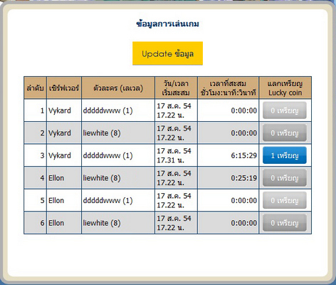 *ในกรณีที่เปิดหน้าต่างกิจกรรมทิ้งไว้ หลังจากที่ logout ออกจากเกมส์แล้ว เพื่อนๆ สามารถตรวจสอบเวลาได้โดยการคลิกที่ปุ่ม Update ข้อมูล